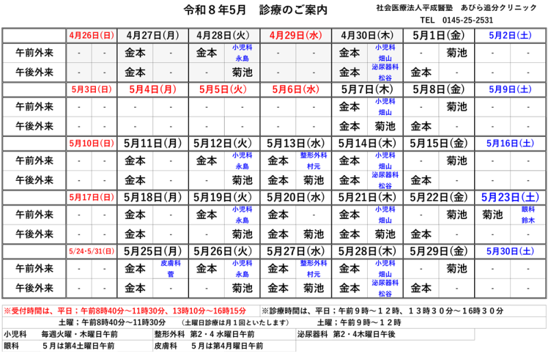 追分クリニック5月(令和8年)診療のご案内